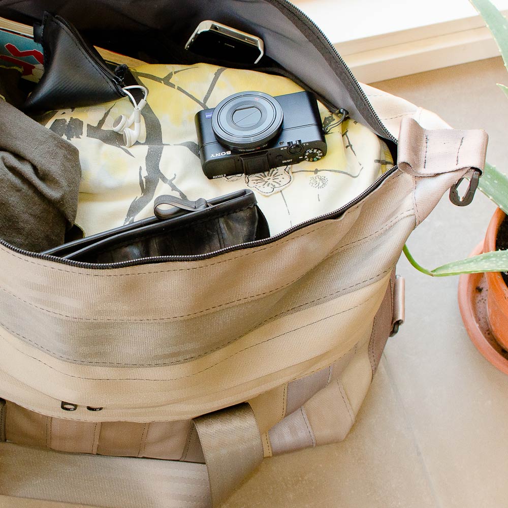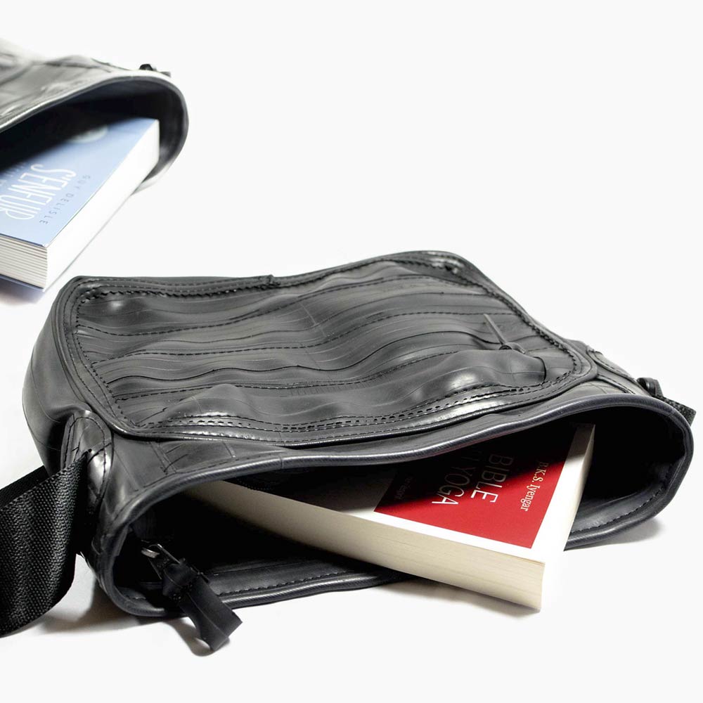 Chaque sac est unique et fabriqué un par un dans notre atelier situé au Québec, au Canada. Nous recyclons d’anciennes affiches publicitaires de vinyle, des chambres à air de vélo, des ceintures de sécurité automobile, des bâches de camion de transport, des toiles de construction en Scafnet® ainsi que des pneumatiques du métro de Montréal. Nos produits faits de matières recyclées sont à la fois design, fonctionnels, éthiques et écologiques.